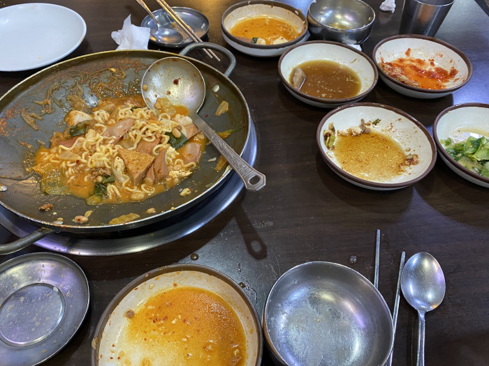 열심히 먹었다. 난 원래 밥을 다 먹으면 더 이상 반찬을 먹지 않는다. 오늘은 예외였다. 밥을 다 먹고도 무려 세 번이나 부대찌개를 더 먹었다. 짰다. 물을 마셨다. 또 먹었다. 엄청 짰다. 물을 마셨다. 밥을 더 시킬까 했지만 그건 무리였다. 결국 다 먹지 못했고, 과유불급을 다시 한 번 되새겼다.