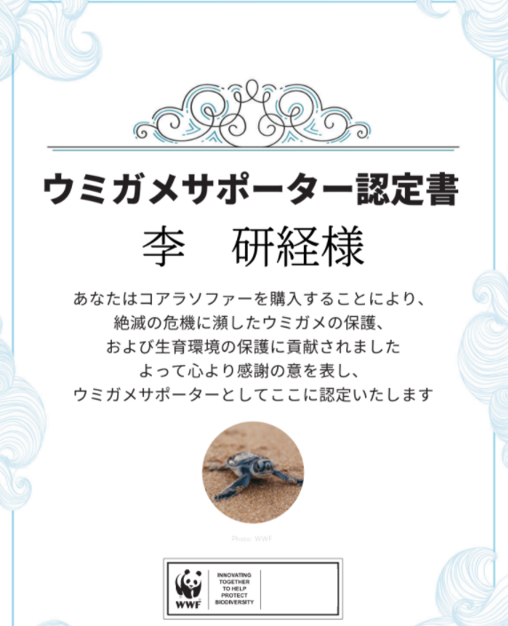 저는 바로 결제를 했고, 5분쯤 지나서였을까요. 기업의 CSR 담당자로부터 메일이 하나 왔습니다. 내용인즉, 제품 구매를 감사하며, 제품 구매로 바다거북이의 보호가 실현되어 감사한 마음으로 서포터 인증서를 보낸다는 내용이었습니다. 물건을 사고 이렇게 뿌듯하고 기쁜 경험은 참 오랜만이었습니다. 나의 소비가 세상의 좋은 일이 되도록 의식하고 사는 것은 어찌 보면 어렵습니다. 아무 생각 없이 필요한 것을 구매하는 것보다는 훨씬많은 고민과 시간을 필요로 하지요. 하지만, 또 어찌 보면 참 쉬운 일입니다. ‘구매하기’를 단 한 번 클릭하는 것만으로, 세상을 좀 더 나아지게 할 수 있으니까요.