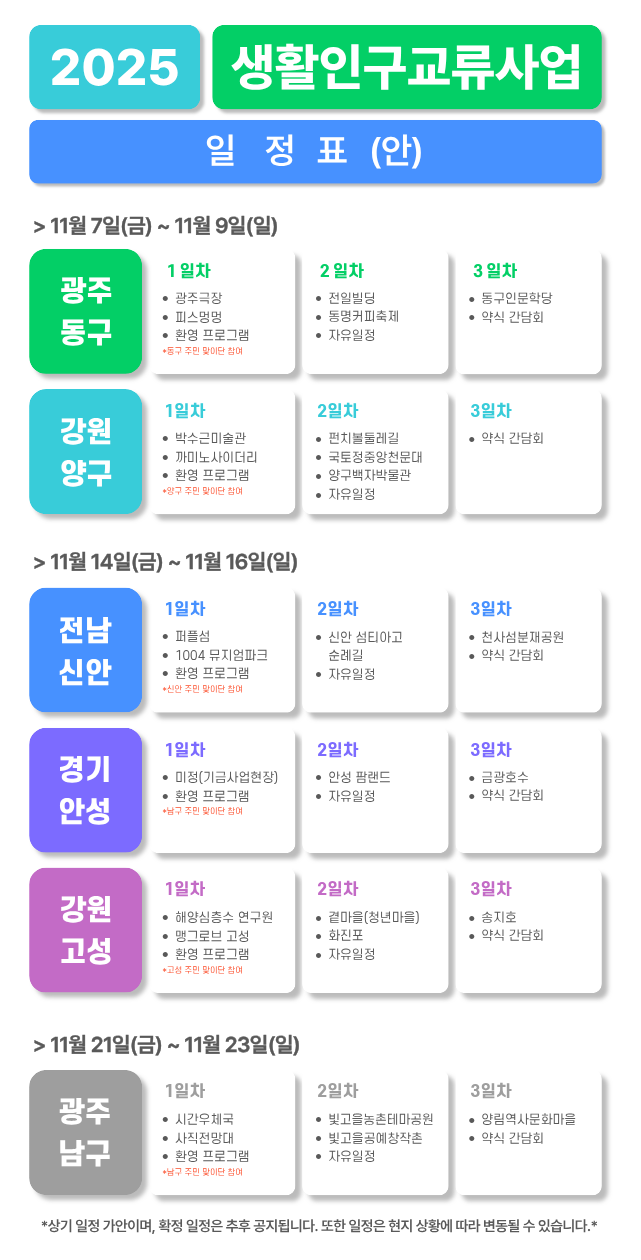 - 11/14(금)~11/16(일) : (집결)광주 동구 → (방문)신안, (집결)광주 남구 → (방문)안성시, (집결)양구군 → (방문)고성군