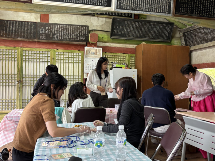 구구절절 안성향교 예절체험의 하이라이트! 유생들이 시를 짓고 사색을 즐기는 휴식 공간 누각에서 시를 듣고 명상하며 다도 체험을 하는 시간을 가졌습니다. 빠르게 바뀌는 것이 익숙한 요즘 아이들에게 좋은 경험이 되었습니다. 외국인 모녀도 참여하였는데, 평소에 해보지 못하는 특별한 체험에 어머니도 흥미롭게 체험에 임하는 모습을 볼 수 있었습니다.