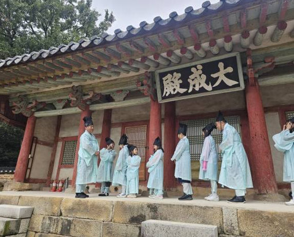 다식을 다 만들고 나서는 유생 옷을 입는 방법에 대해 차근차근 알아보는 시간을 가졌습니다. 현대 옷과 많이 다른 옷의 구조에 아이들이 의아해하기도 했는데요, 왜 이런 옷의 구조가 있는지 차근차근 설명해주셔서 옷에 담긴 조상들의 지혜를 엿보는 시간이었습니다. 유생옷을 입고 향교를 거닐며 예의를 지켜 계단을 올라가는 법도 배우고, 시끌벅적하던 아이들이 차분해지는 시간이었습니다.