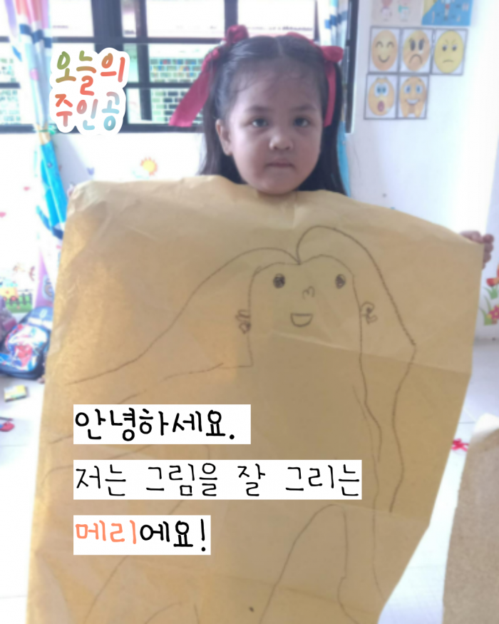 오늘 소개할 친구는 메리 입니다! 메리는 매우 친절한 친구예요. 반 친구들의 이름을 쉽게 익히고 잘 어울리며, 친구들에게 음식을 나누어 주는 것도 좋아하는 우리 다정한 메리! 처음에는 조용하지만, 친해지면 말이 많은 편이고, 그녀는 책과 종이에 글을 쓰고 그리는 것을 좋아하는 명랑한 친구랍니다.
