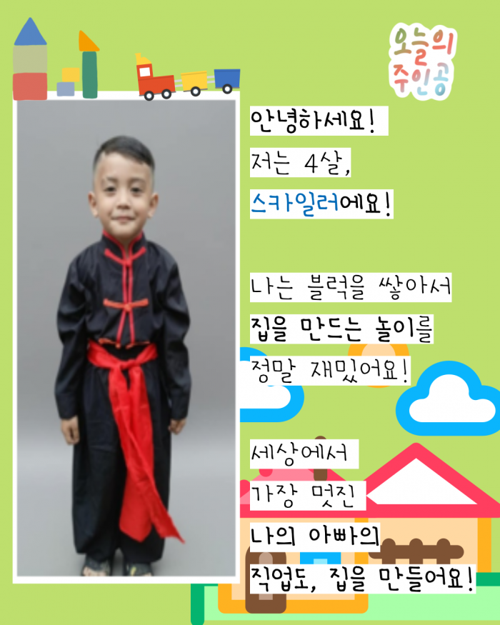 10월에는 유엔의 날을 기념하여 아이들이 다양한 나라의 전통 의상을 입어보는 시간도 가졌습니다. 아이들이 자신을 대표하는 나라를 선정하여 자신을 포함하여 소개한다는 사실이 흥미롭지 않나요? 우리 아이들의 표정에서 설렘과 떨림, 그리고 결연에 찬 모습이 보이네요! 아이들의 표정에서 얼마나 자기소개와 나라 소개를 열정적으로 했는지 그 열기가 느껴집니다.